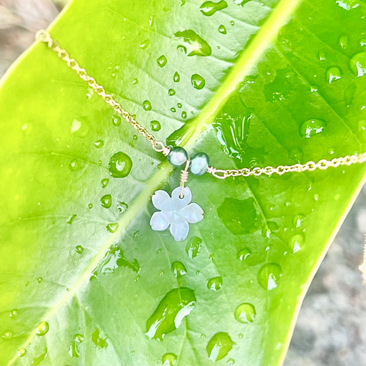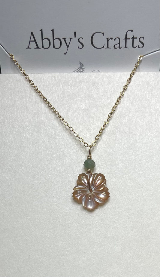 Hibiscus Flower Mother of Pearl Shell Necklace with Emerald Gold