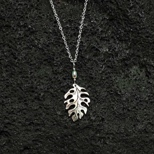 Monstera Leaf & Flower with Pearl Silver Necklace